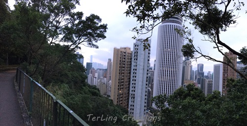 The next early morning I went up the trail behind my apartment in order to get some weeds. The round building, once the tallest in our city is next to my block and I worked there for more than 25 years. Though among the high rises we're in the lush.
