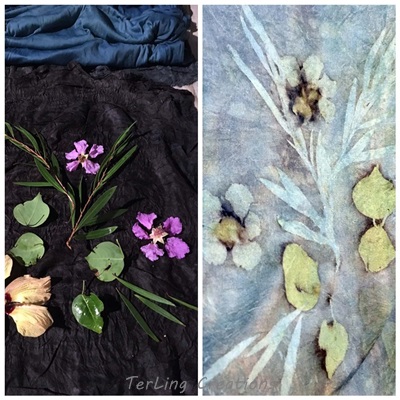 Leaves of Indigofera tinctoria (木藍) truly amazing prints. Direct prints on silk color from khaki to pink while yellow from alum soaked eucalyptus silver dollar on tannin mordant knit silk jersey.